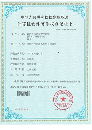 九江升阳计算机系统有限公司的“违法违规建设管控系统”顺利通过中国版权保护中心审核,获得国家版权局颁发的计算机软件著作权登记证书。